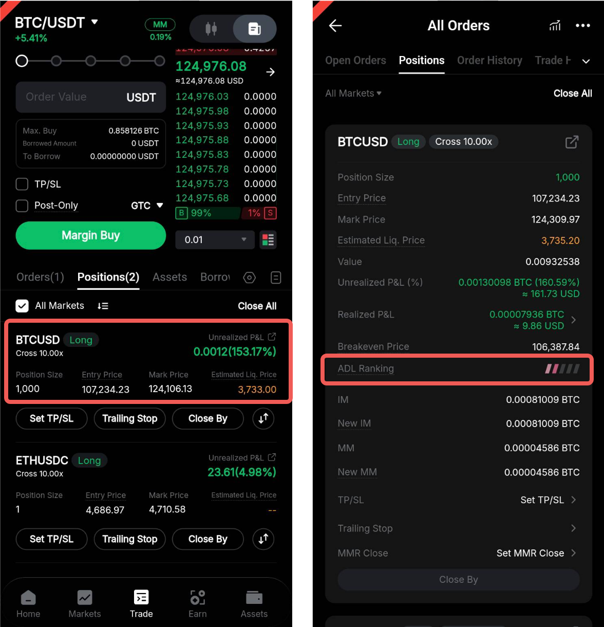 The ADL ranking is determined based on the leveraged return of a position. Please note that opposing positions that are at a loss may still be selected, but those in profit are given priority.