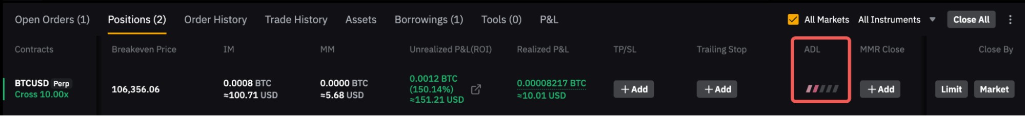 Traders with the highest ADL rankings are selected first for deleveraging. Traders can refer to the ADL priority lights on their positions to estimate their ADL rankings.