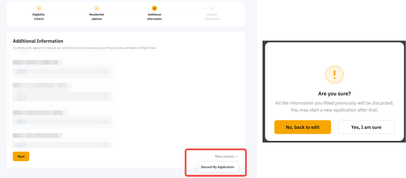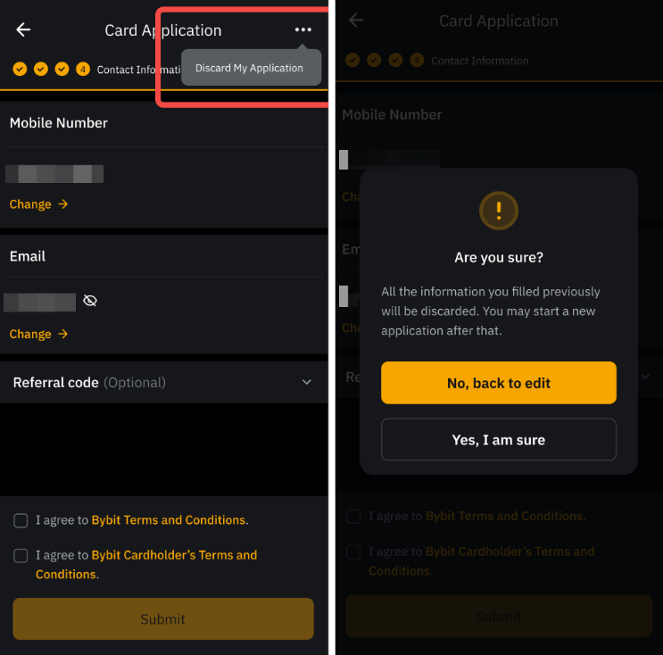 You can cancel your Bybit Card application by clicking on View my application → More Actions and selecting Discard My Card Application