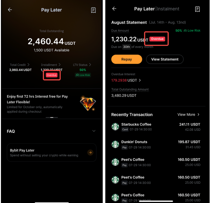 By tapping Installment on the Bybit Pay Later page → (a) View Statement or (b) Overdue Interest, you can see the overdue interest and each breakdown.