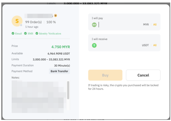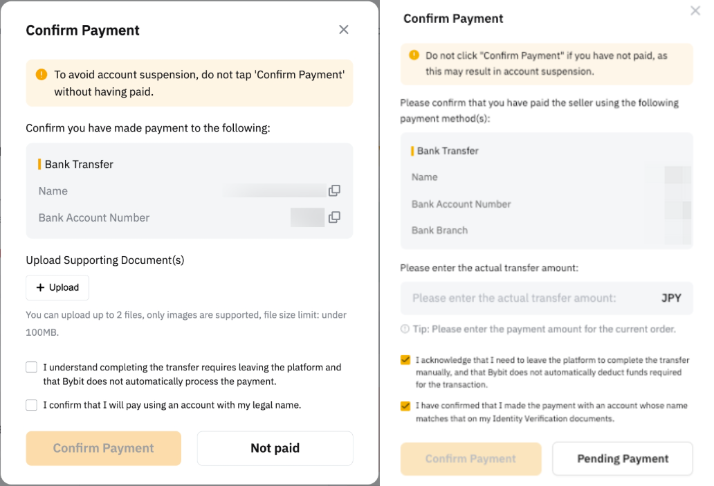 — Your bank account name must be consistent with your registered name on Bybit. Otherwise, your account might be suspended and you may encounter permanent asset loss as the seller has a right to refuse to release the coin to you.