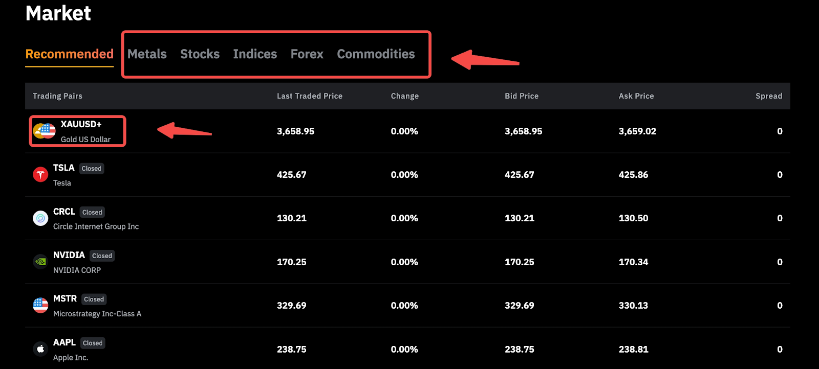 Step 3: Select your preferred trading symbol to be redirected to the trading page and start trading.