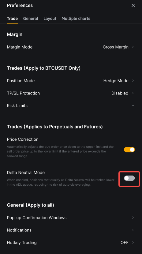Step 3: Under the Trade tab, turn on the Delta Neutral Mode toggle.