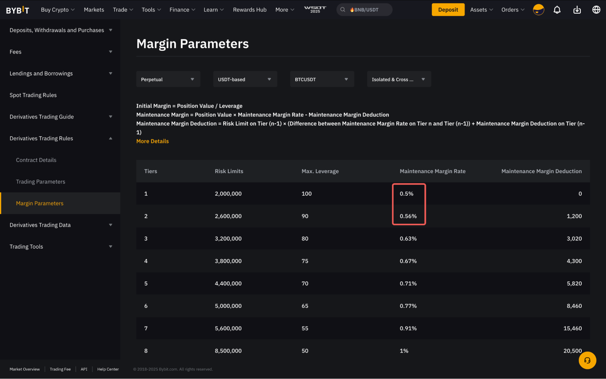 The MMR required for each risk limit tier and the Maintenance Margin Deduction amount can be easily found on the Margin Parameters page.