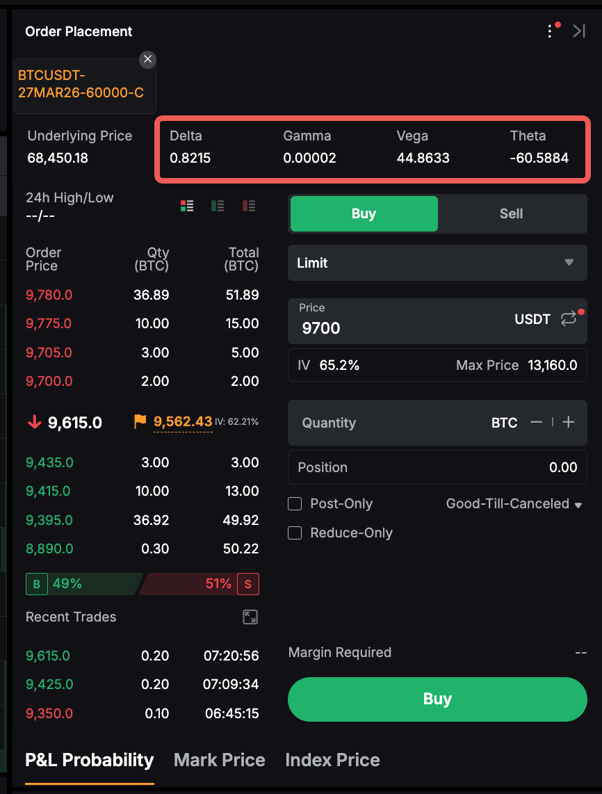 In the order zone, you can see the Greeks of the option you want to buy or sell, including Delta, Gamma, Vega and Theta.