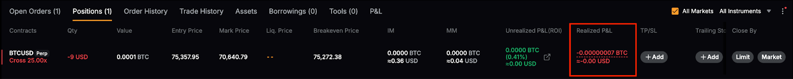 Based on our earlier calculation, the position's unrealized P&L = 0.0004 BTC