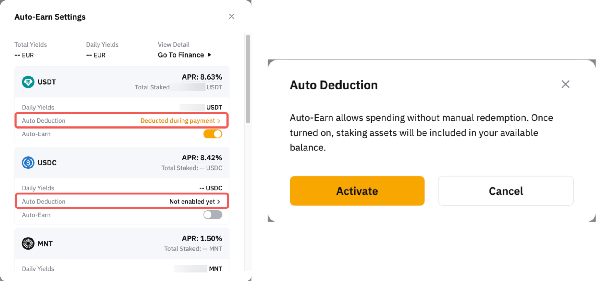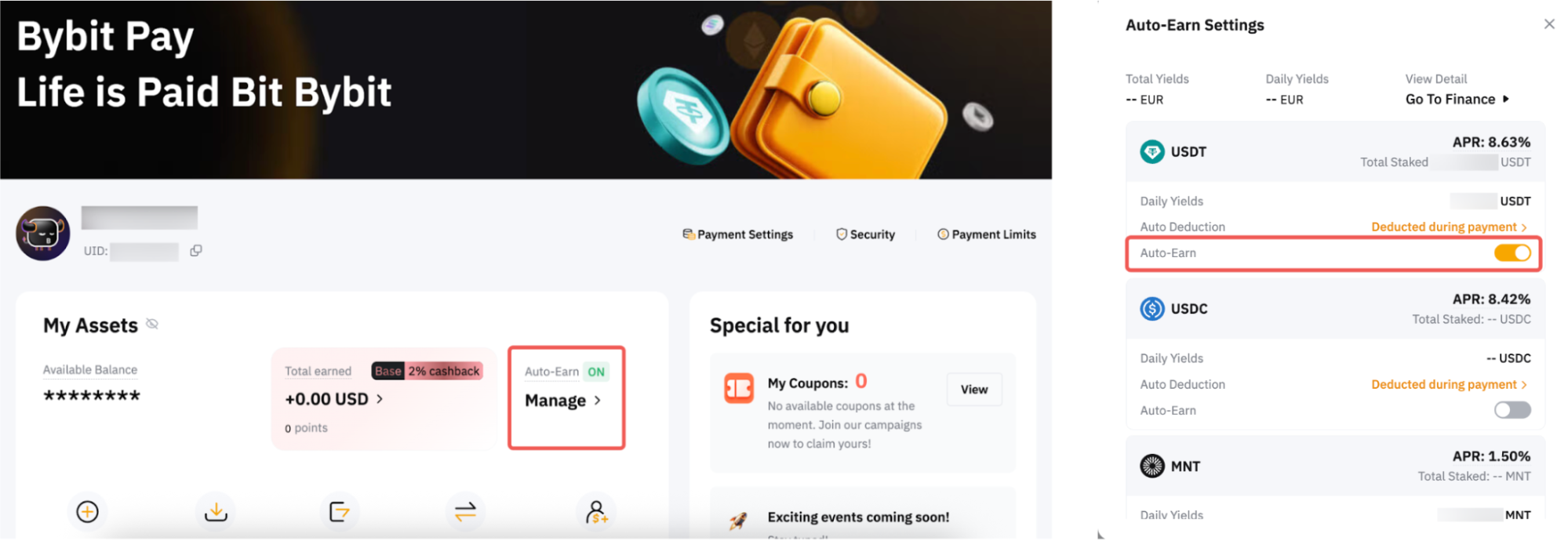 Además, también puede obtener intereses compuestos en su plazo flexible (no disponible directamente en la página Easy Earn) al habilitar la Autodeducción en el panel de Bybit Pay.