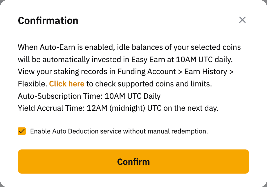 El importe asignado durante cada ejecución de la suscripción está sujeto al importe de inversión máximo o mínimo de Easy Earn. Si se alcanza el monto mínimo de inversión requerido, los fondos se invertirán automáticamente en planes de plazo flexible, hasta el monto máximo de inversión. Sin embargo, si se supera o no se alcanza el límite, la suscripción de Ganancia automática fallará para ese día. Los límites de inversión específicos se pueden encontrar en los detalles de los correspondientes planes a plazo flexible.