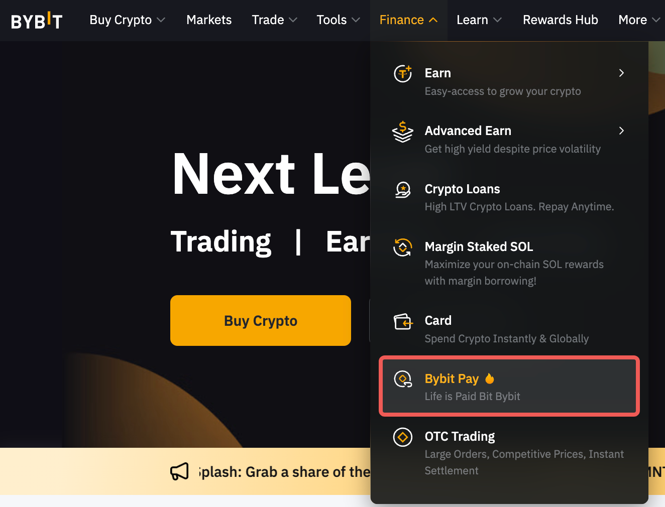Paso 1:  Diríjase a Finanzas en la esquina superior izquierda de la barra de navegación en la página Bybit y, a continuación, seleccione Bybit Pay para entrar en la página Bybit Pay.