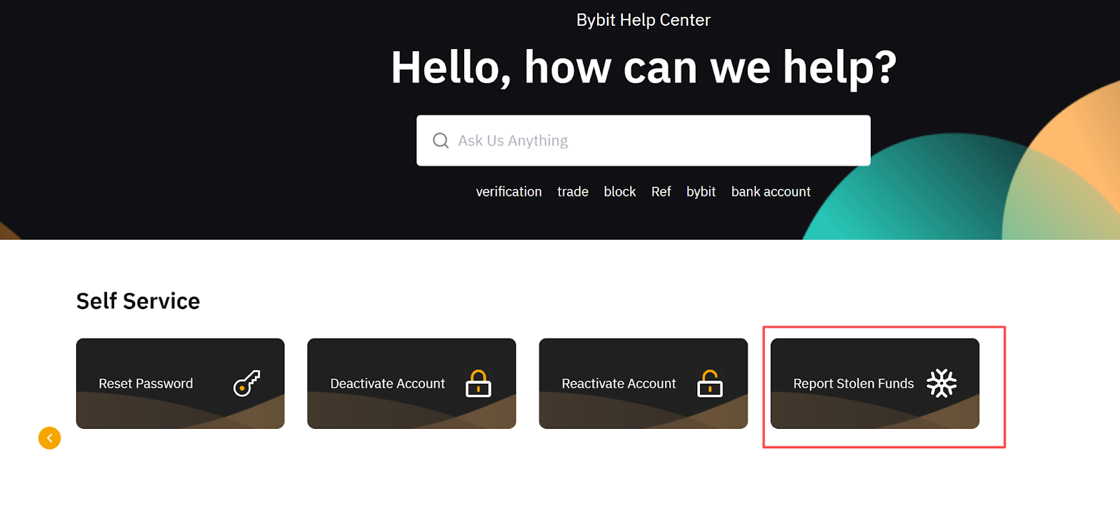 Ve al Centro de ayuda y haz clic en la flecha derecha en la sección de Autoservicio para encontrar Informar sobre fondos robados.