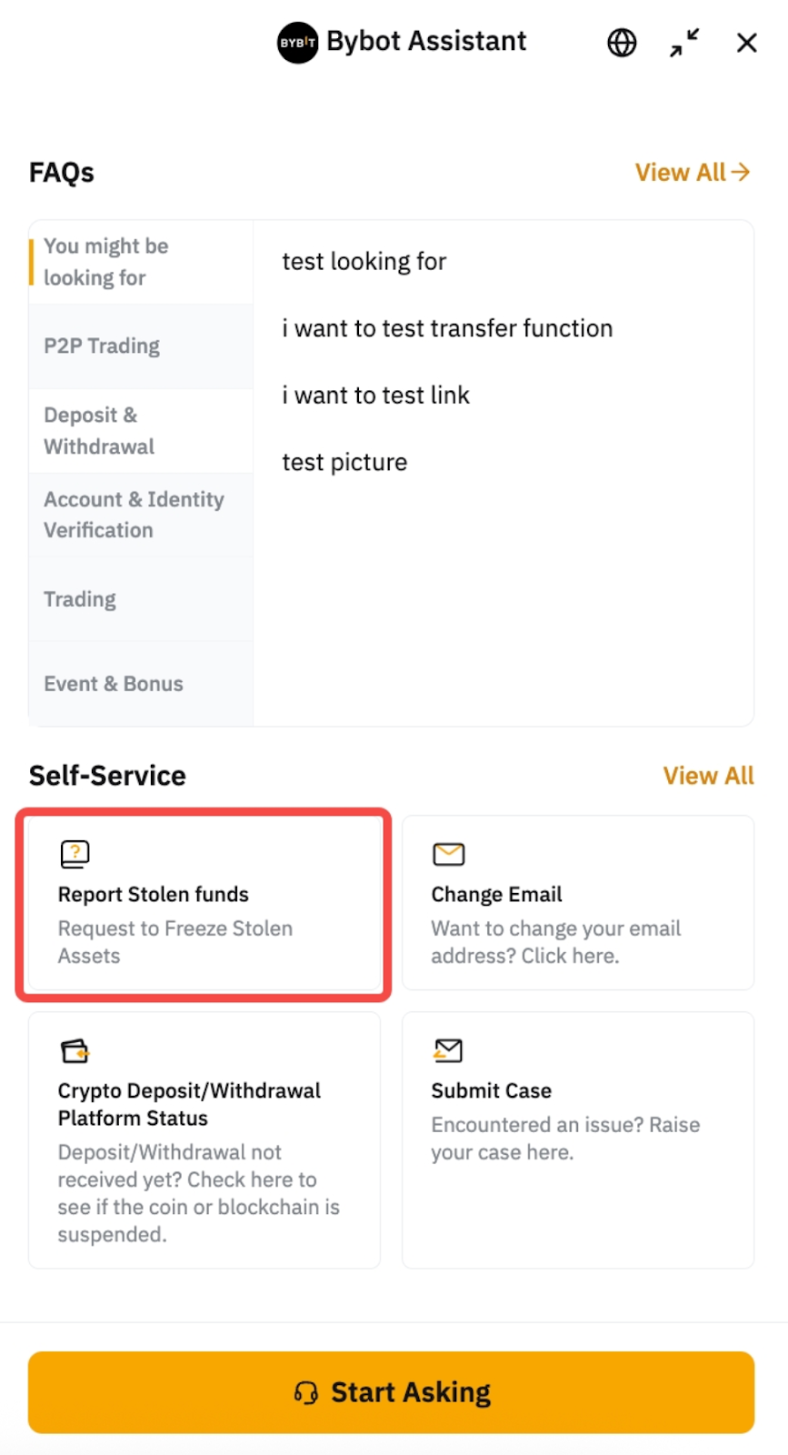 Haz clic en el ícono de Atención al cliente en la esquina inferior derecha, luego desplázate hacia abajo hasta la sección Autoservicio y seleccione Informar sobre fondos robados.
