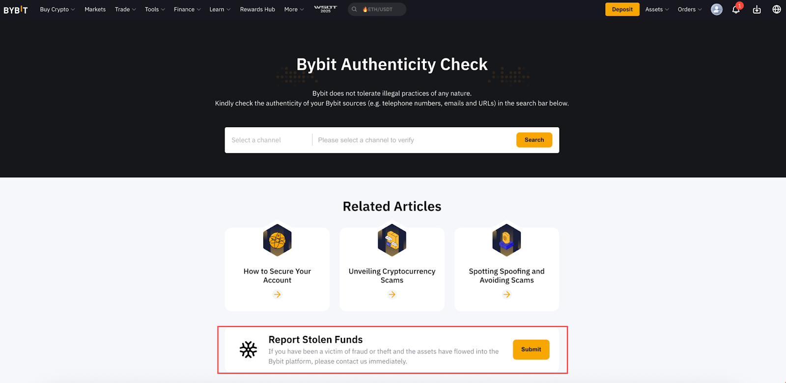 Visita la página de verificación de autenticidad de Bybit y haz clic en Enviar en la sección Informar sobre fondos robados.