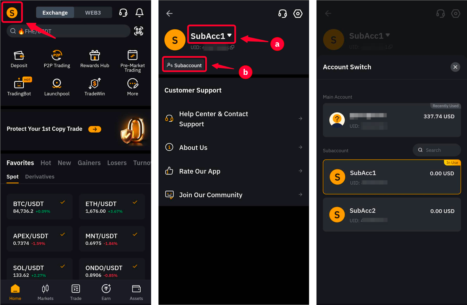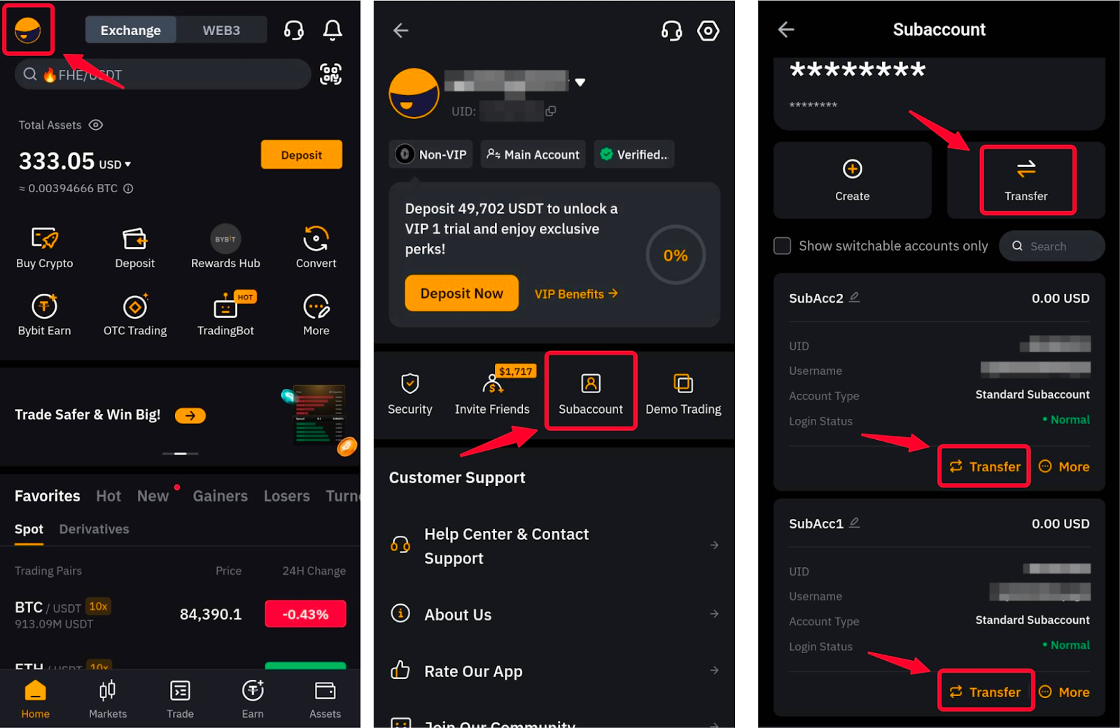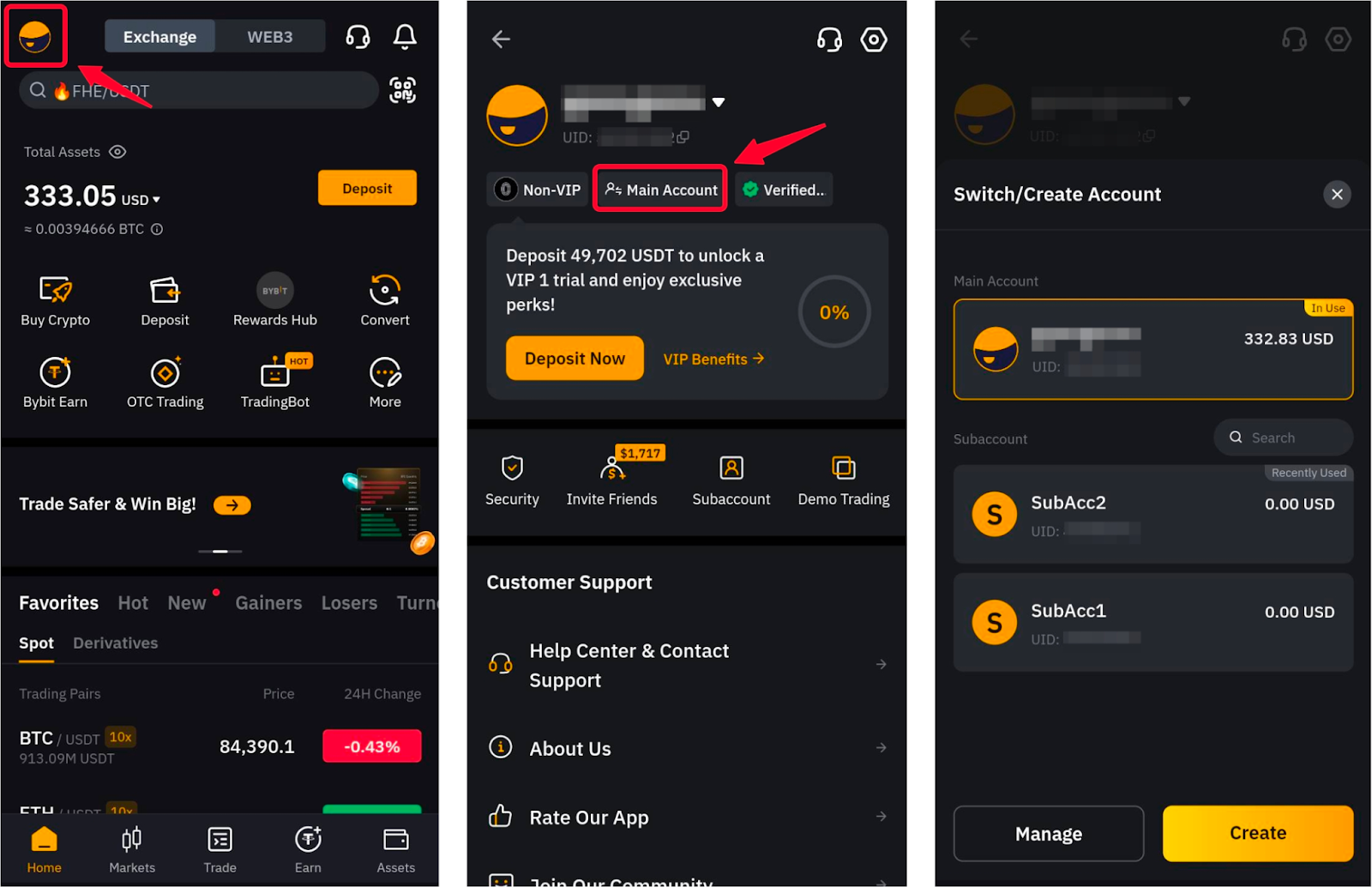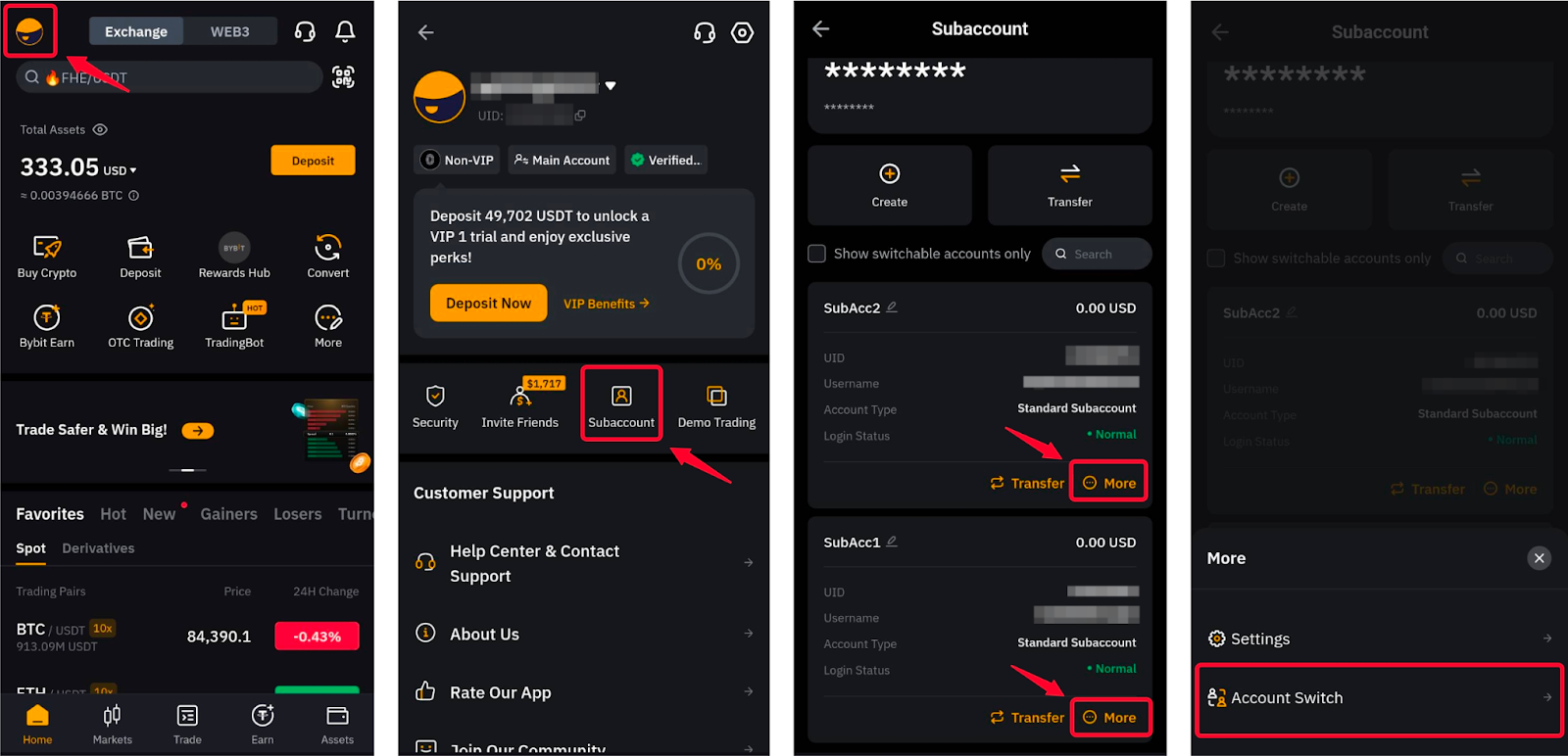 Bybit ahora ofrece a los usuarios la comodidad de cambiar entre sus diferentes cuentas sin esfuerzo utilizando la función de cambio de cuenta. Podrás cambiar entre tus cuentas de tres (3) maneras diferentes: