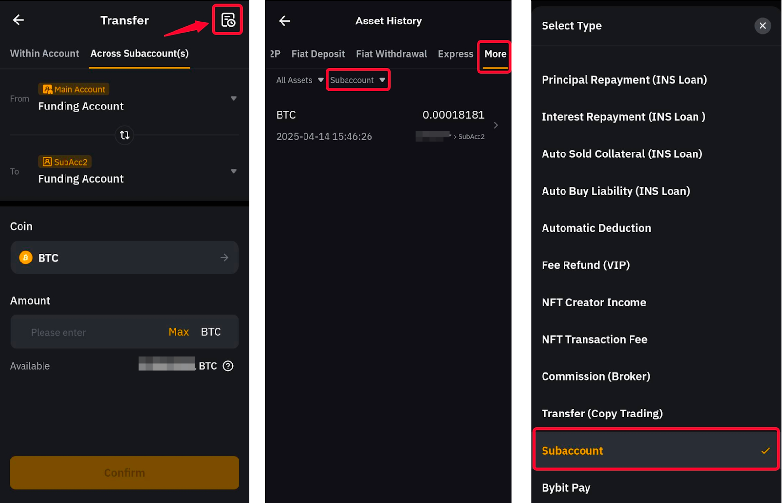 Puedes comprobar el historial de transferencias de fondos de tus subcuentas abriendo la ventana Transferencia, accesible a través de los activos o las páginas de tu cuenta o a través de la página Subcuenta.