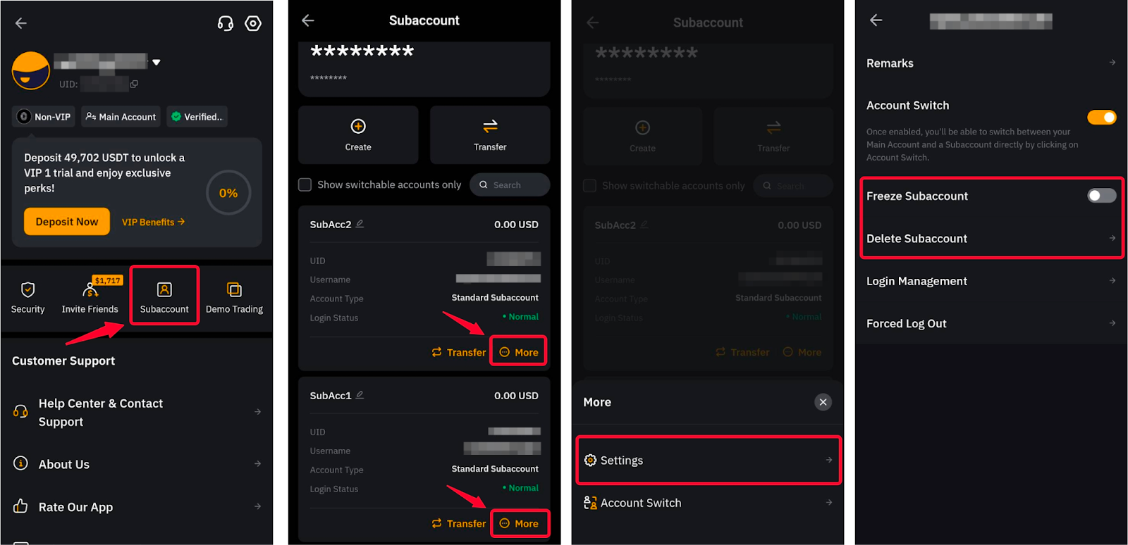Para eliminar/congelar tu subcuenta, debes abrir la pestaña Subcuenta haciendo clic en tu foto de perfil en la esquina superior izquierda. Toca el botón Más de la subcuenta correspondiente, abre la Configuración y haz clic en Congelar subcuenta o Eliminar subcuenta.
