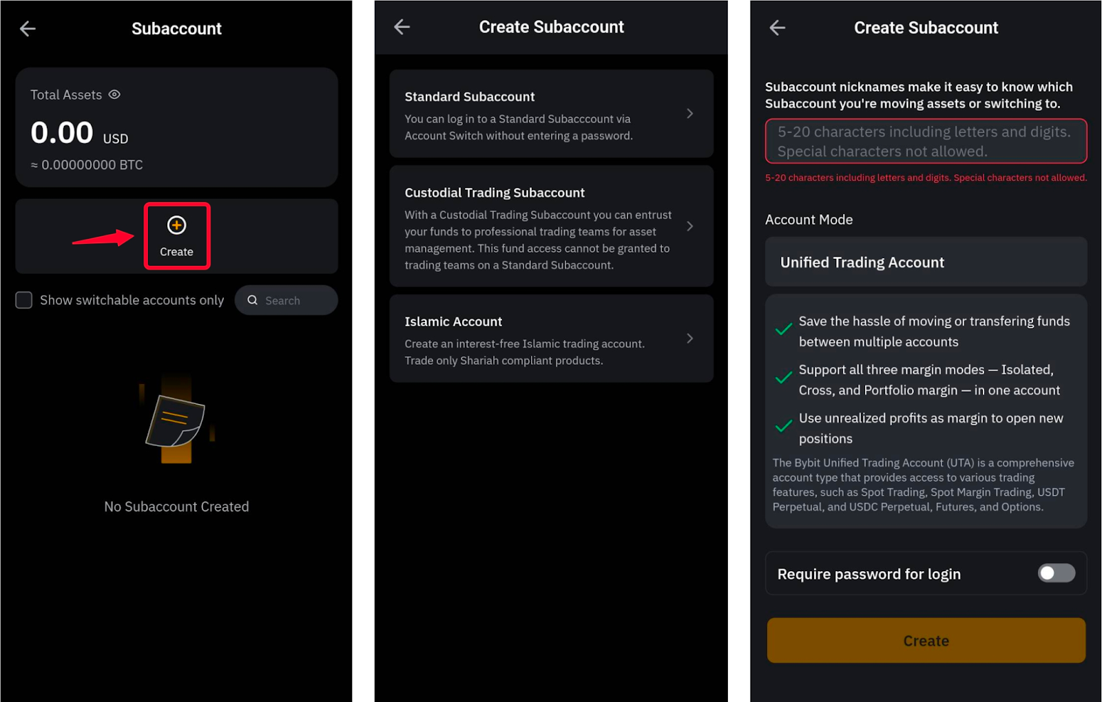- Para asegurar el acceso a tu subcuenta, puedes habilitar la función Solicitar contraseña para iniciar sesión y completar directamente el nombre de usuario y la contraseña de tu nueva subcuenta. El nombre de usuario de la subcuenta se utilizará en la plataforma para identificar tu subcuenta e iniciar sesión. Ten en cuenta que el nombre de usuario no se puede cambiar después de crear la subcuenta.