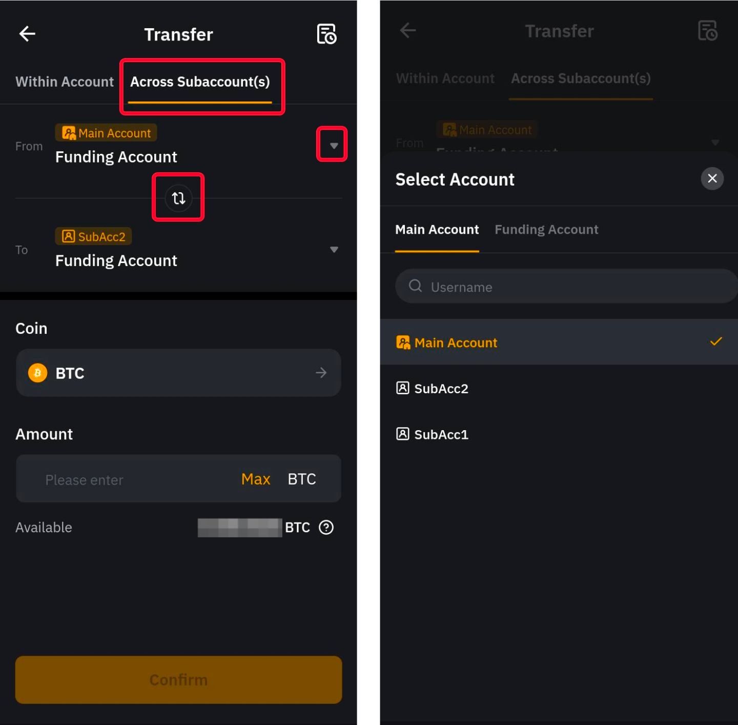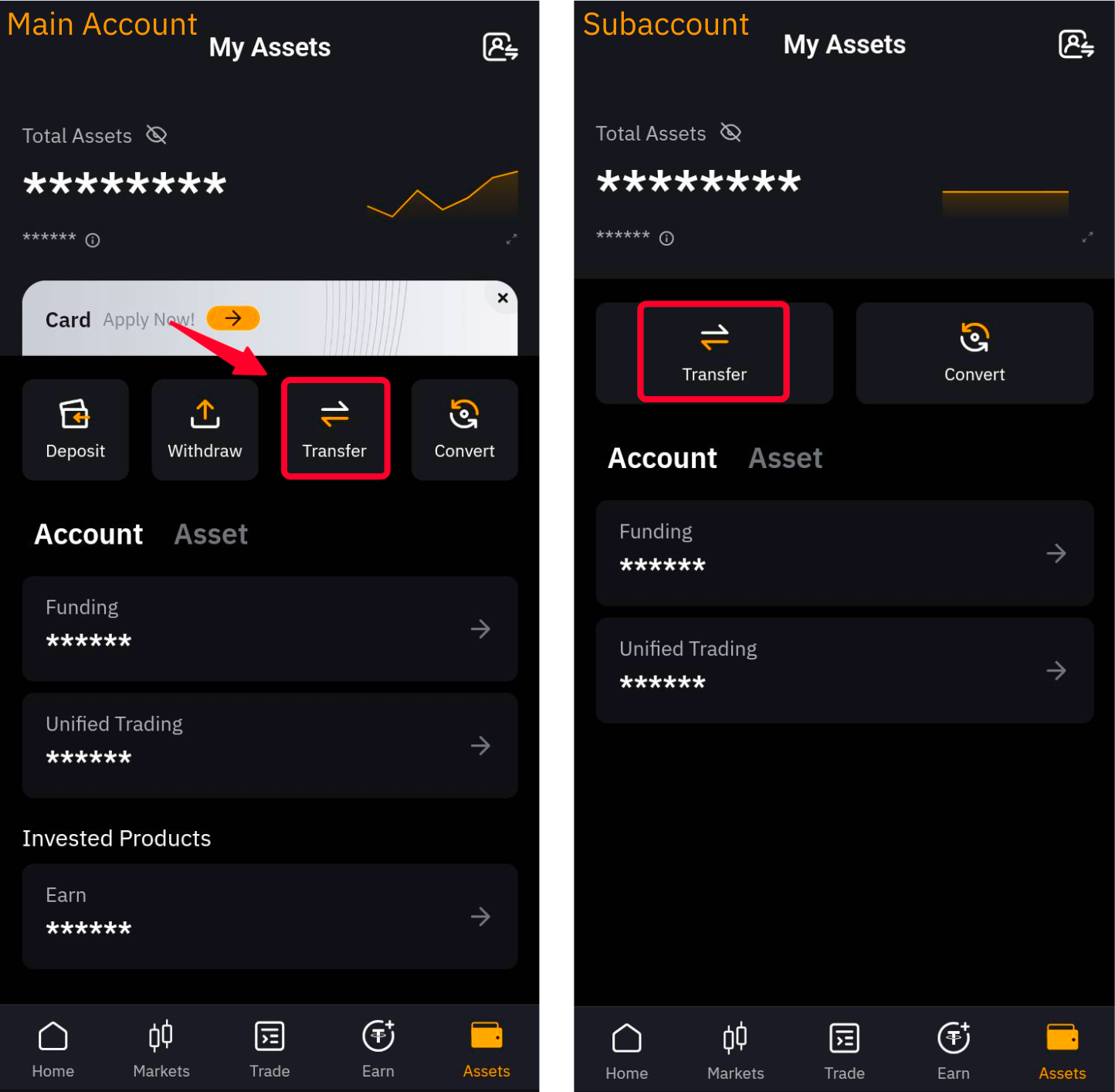 Puedes hacer clic en Transferir en la página Subcuenta de tu cuenta principal para transferir activos entre cualquier cuenta al instante y sin comisiones.