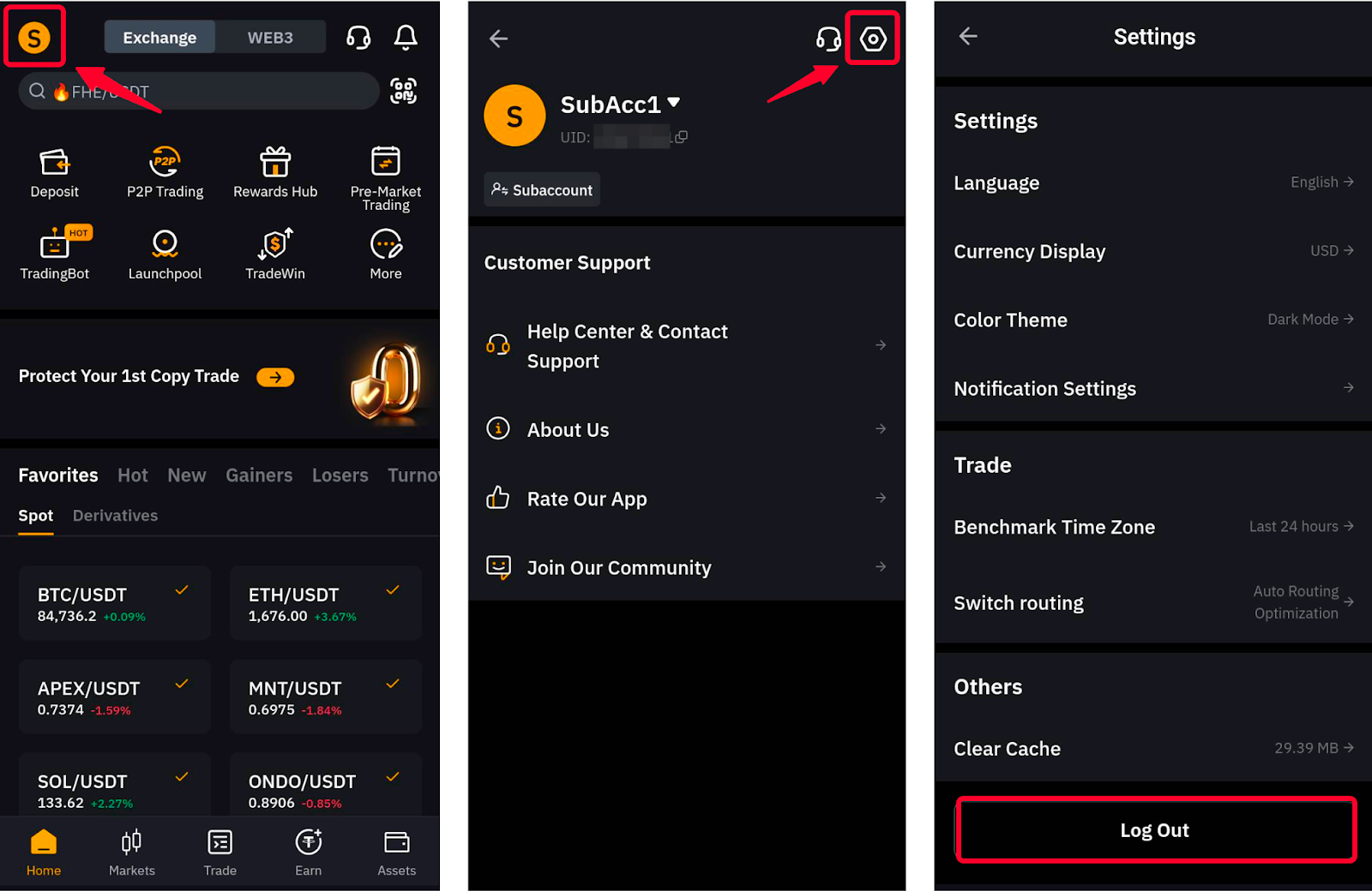 Cuando inicies sesión a través de la página de inicio de sesión de Bybit, podrás cerrar sesión en tu subcuenta tocando en tu foto de perfil en la página de inicio, abriendo la página de configuración y desplazándote hacia abajo hasta el final del menú para tocar el botón Cerrar sesión.