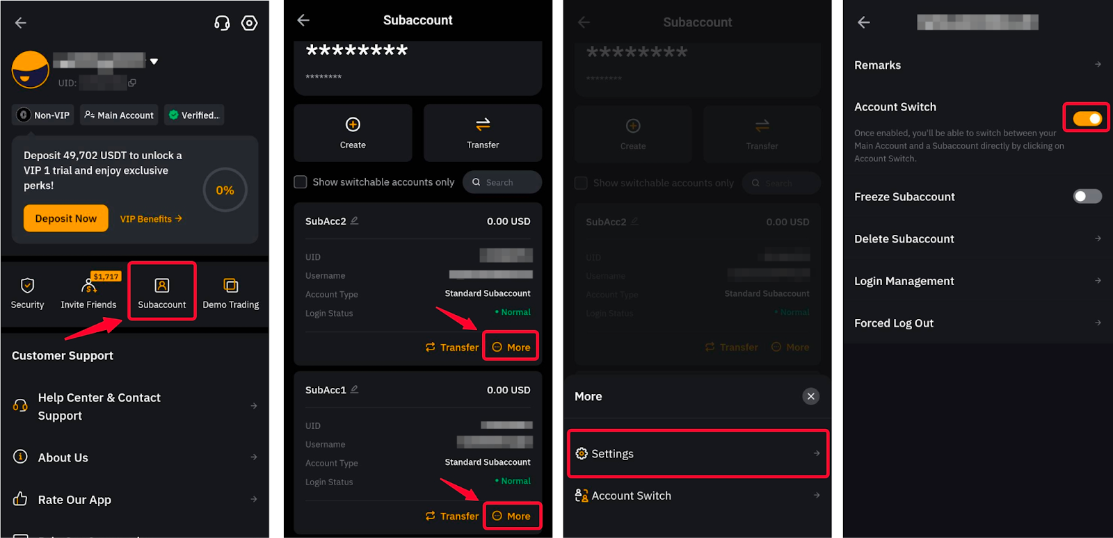 La función Cambiar cuenta está habilitada de forma predeterminada. Si deseas desactivarlo de una subcuenta, localiza tu subcuenta y toca en Más → Configuración y desactiva la palanca de la función Cambiar cuenta.