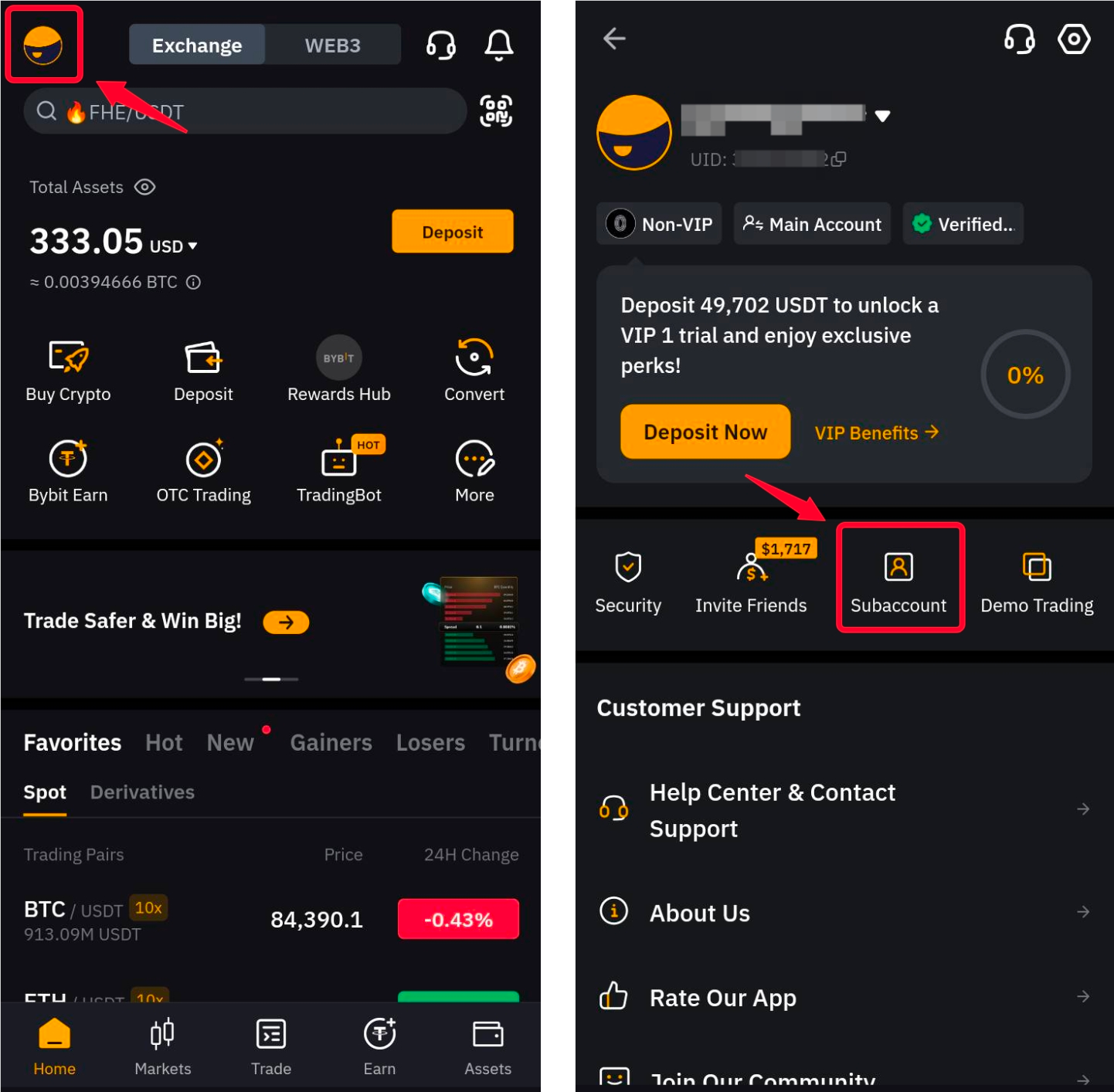 Paso 1: Inicia sesión en tu aplicación Bybit y toca el icono de perfil en la esquina superior izquierda para acceder a la pestaña Subcuenta.