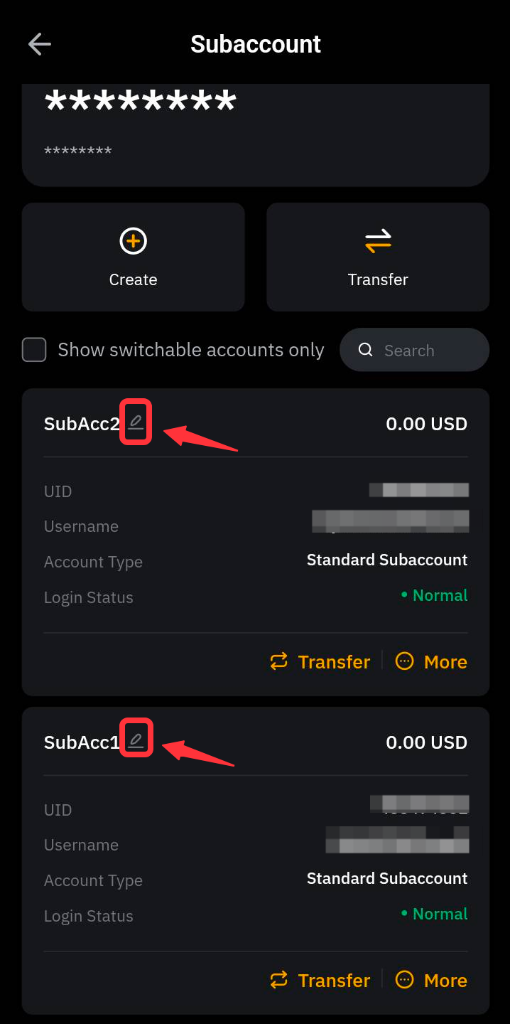 Para actualizar el apodo de tu subcuenta, simplemente ve a la página de tu subcuenta y toca el icono del lápiz que ves junto al apodo de tu subcuenta.