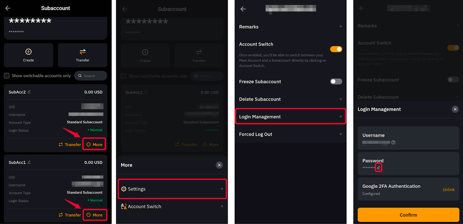 En cuanto a la actualización de la contraseña, simplemente ve a la subcuenta relevante, toca en Más → Configuración → Gestión de inicio de sesión y tap en el icono del lápiz que ves junto al apodo de tu subcuenta. Se te pedirá que indiques tu nueva contraseña y que confirmes la actualización introduciendo el código de verificación 2FA de tu cuenta principal.