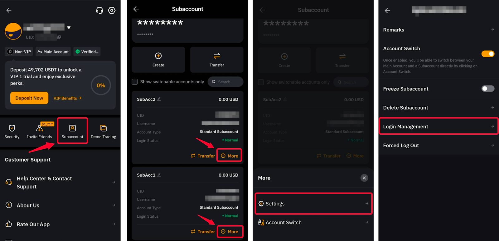 Ten en cuenta que si inicialmente creaste una subcuenta estándar sin ninguna configuración de contraseña, solo puedes iniciar sesión a través de Cambiar cuenta desde tu cuenta principal. Para activar el inicio de sesión a través de la página de inicio de sesión de Bybit, conéctate a tu cuenta principal y, en la página Subcuenta, localiza tu subcuenta y toca en Más → Ajustes → Gestión de inicio de sesión. Ahora puedes recuperar el nombre de usuario de tu subcuenta y configurar una nueva contraseña.
