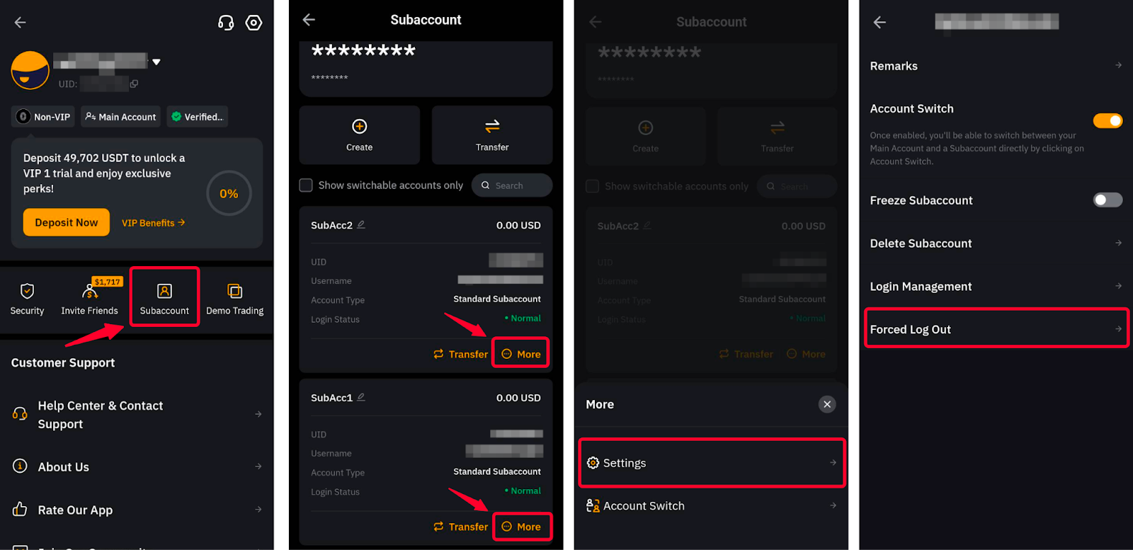 En tu cuenta principal, también tienes la posibilidad de cerrar sesión en tu subcuenta en otros dispositivos utilizando el botón Cerrar sesión forzoso disponible para cada subcuenta tocando en Más → Configuración → Cerrar sesión forzoso.