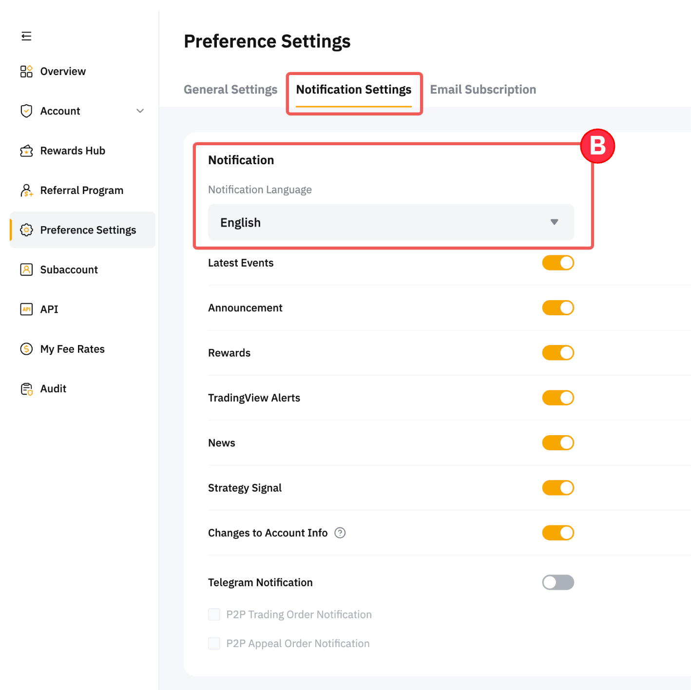 Seleccione su idioma de notificación preferido en el menú desplegable de la ficha Configuración de notificación. Tenga en cuenta que esta configuración de idioma solo se aplica a las notificaciones por correo electrónico que reciba. Para modificar el idioma del sitio web o las notificaciones emergentes, consulte esta guía.