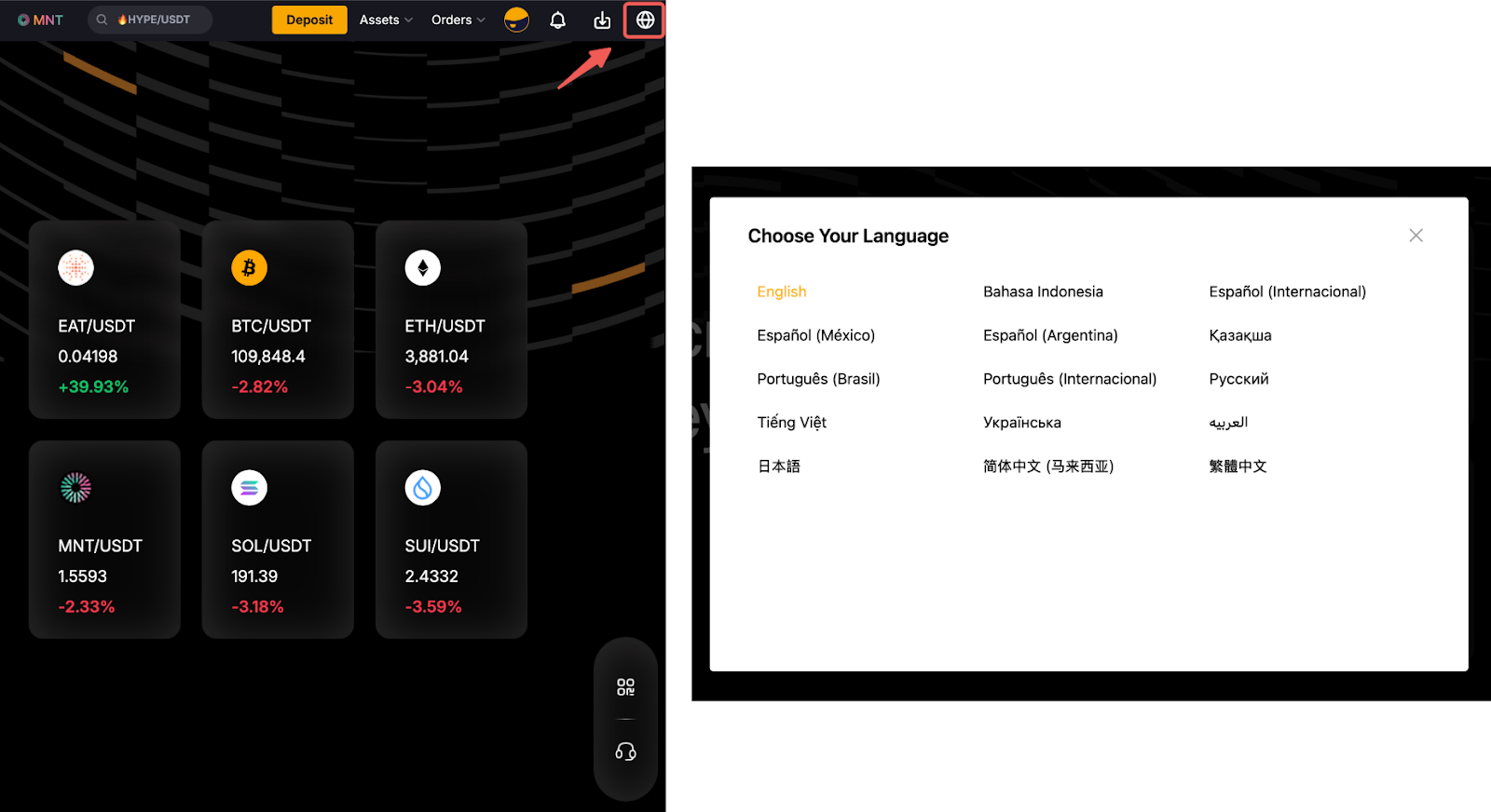 En la esquina superior derecha del sitio web, haga clic en el icono del globo para abrir la lista de idiomas disponibles y seleccionar su idioma preferido.