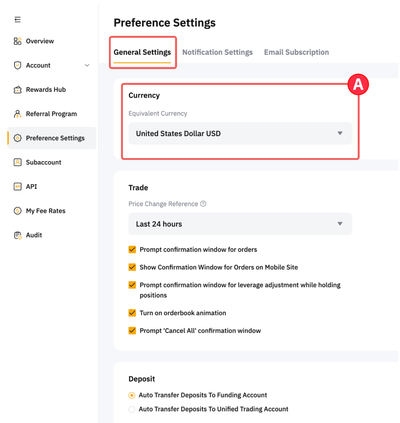 Seleccione su moneda preferida para mostrarla en el sitio web de Bybit en la pestaña Configuración general. Esta moneda se utilizará para darle una estimación de sus fondos y cantidades de pedidos para comprender mejor el valor en su cuenta.