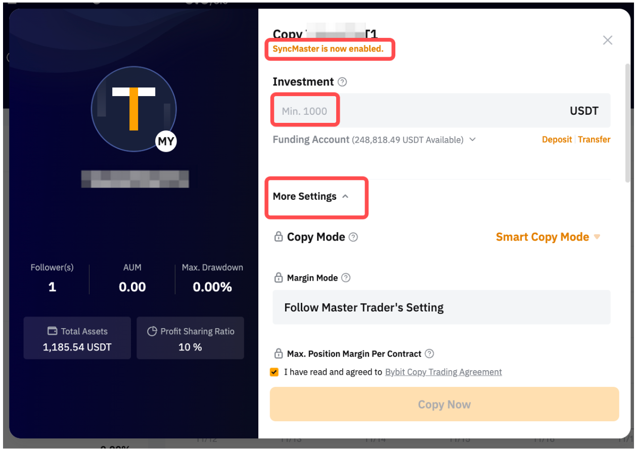 Tenga en cuenta que SyncMaster se aplica actualmente a las Operaciones Perpetuas USDT y no se aplicará a los Bots de Trading en Copy Trading.