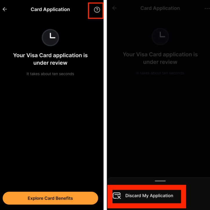 No aplicativo, você pode clicar em Visualizar minha aplicação e, em seguida, no botão '?'. Em seguida, escolha Descartar minha aplicação de cartão.