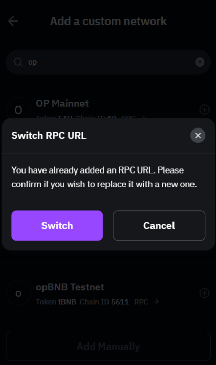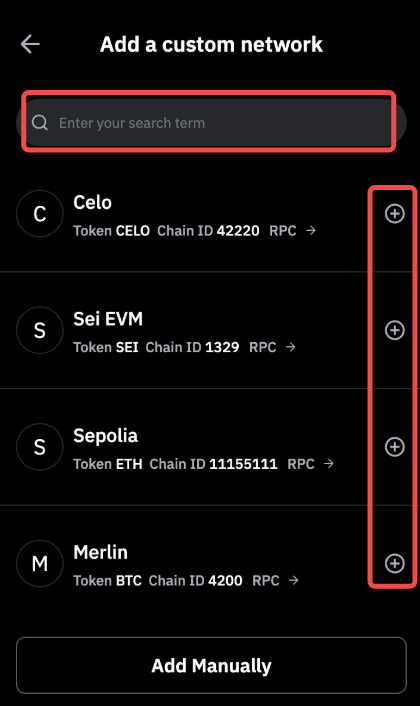 Шаг 2. Введите действительное название сети и после того, как вы найдёте сеть, нажмите на значок +, чтобы добавить его в свой кошелёк.