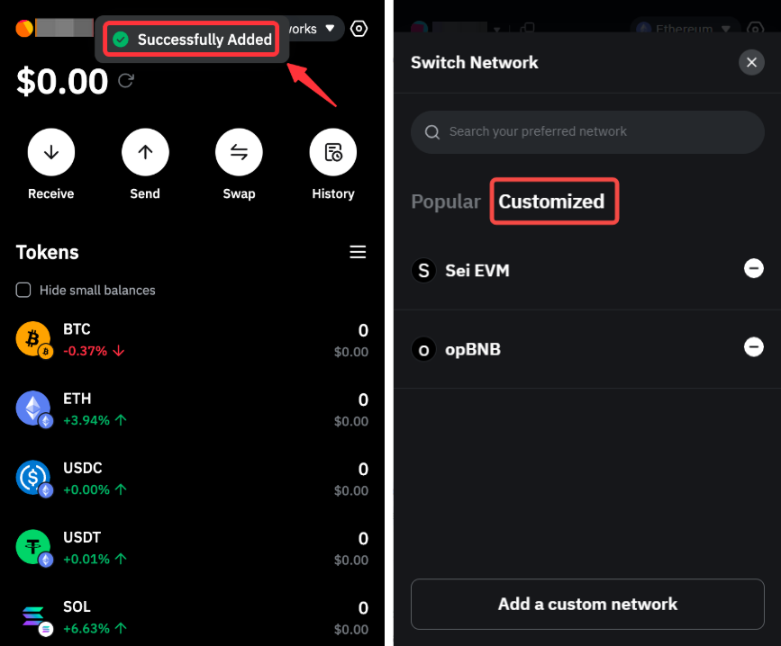 Сеть будет успешно добавлена в ваш кошелёк Bybit. Все пользовательские сети можно просмотреть во вкладке Настраиваемые на странице Сеть.