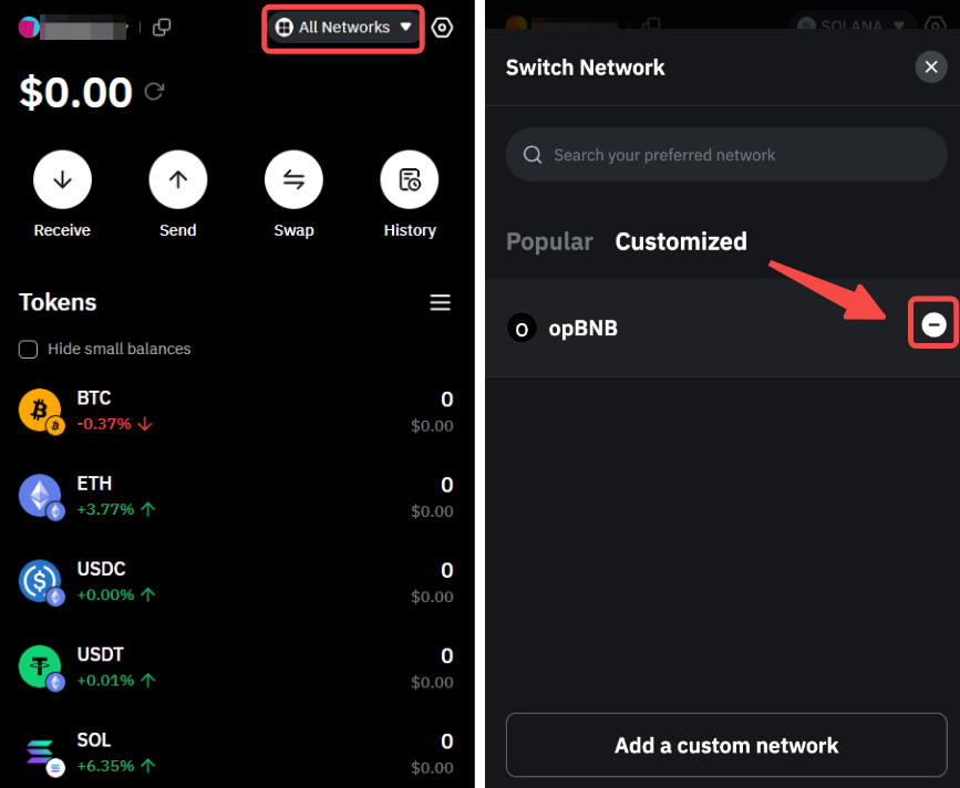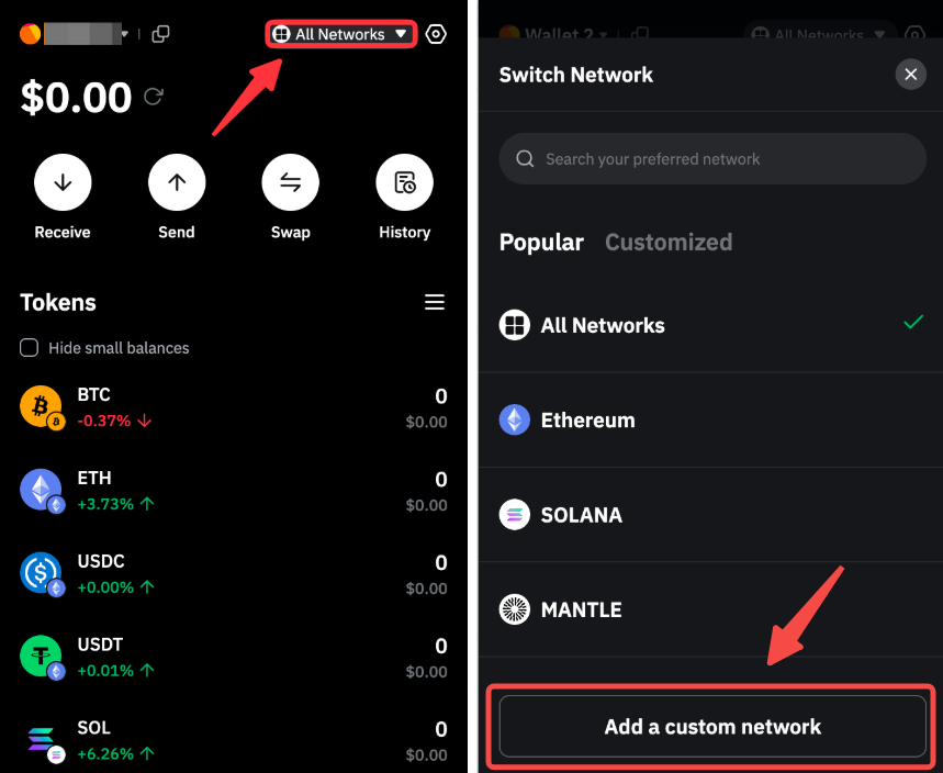 Шаг 1. Чтобы добавить пользовательскую сеть, откройте расширение Bybit Wallet и нажмите Все сети → Добавить пользовательскую сеть.
