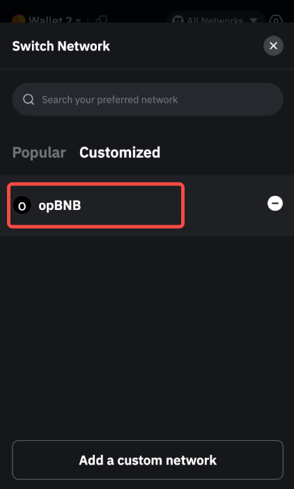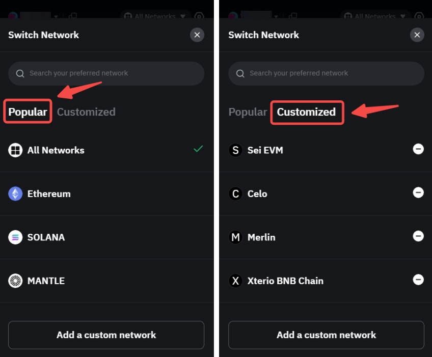Шаг 1. Пожалуйста, нажмите Сеть в расширении. На вкладке Популярные отображаются все сети, добавленные по умолчанию на Bybit Wallet, а на вкладке Настраиваемые отображаются все пользовательские сети, добавленные в ваш кошелёк.