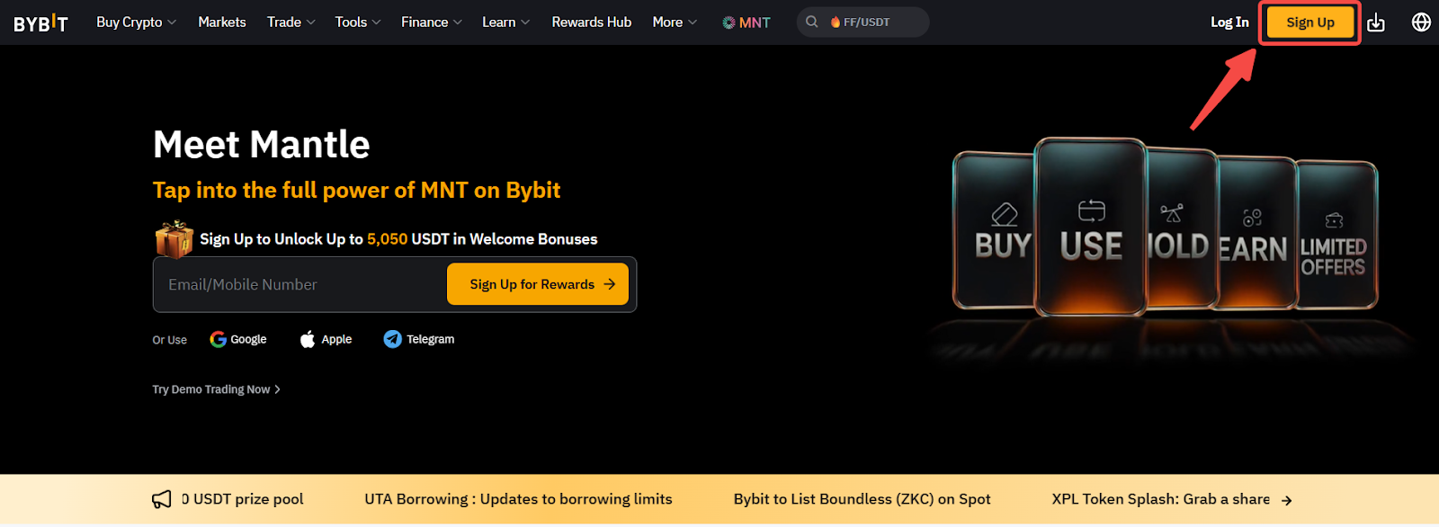 Шаг 1. На главной странице веб-сайта Bybit нажмите Регистрация в правом верхнем углу, чтобы перейти на страницу регистрации.