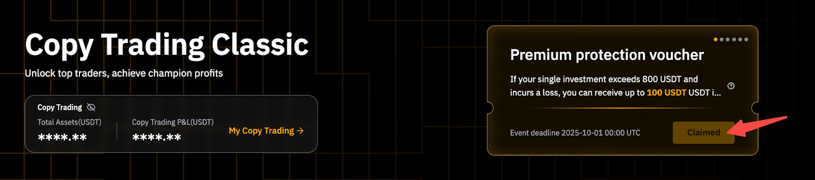 领取保赔卷后,首次选择交易达人后至少投资100 USDT**。 |