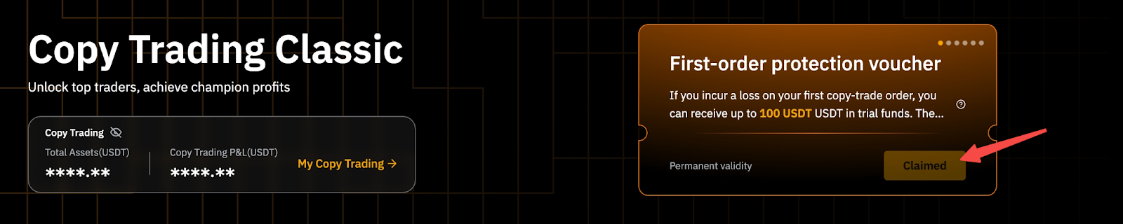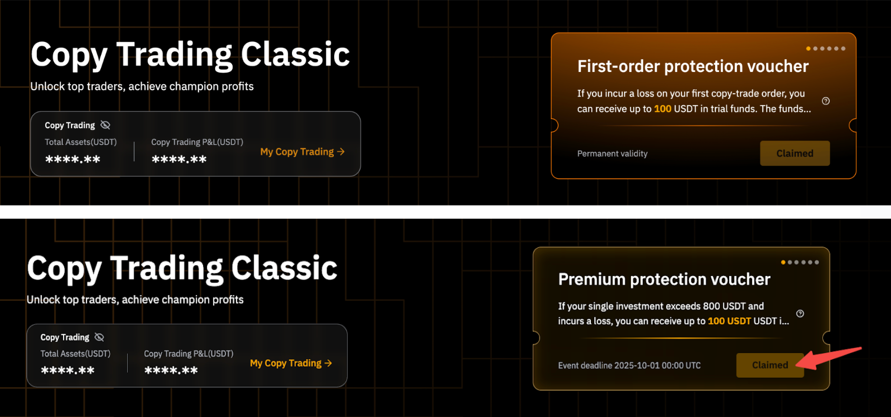 - 永久有效。 - 领取后,保赔卷将一直有效,直至用于首次符合条件的跟单订单。 示例:Jason 于 2025 年 1 月 1 日领取了首单保赔卷。保赔卷将无限期有效,直至第一位符合条件的交易达人下单。 |