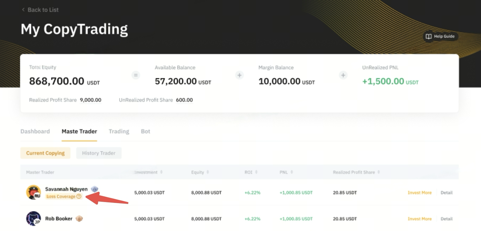 领取保赔卷后,选择现有交易达人或新选择交易达人后,一次性至少投资800 USDT**。 |