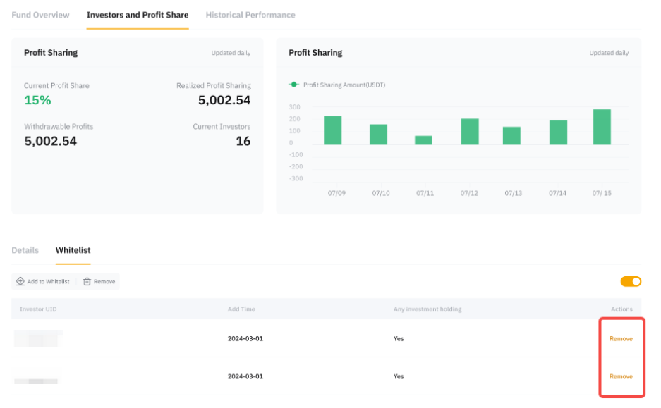 如需将投资者移出白名单,请前往 Pro 达人中心 → 投资者与分润 → 白名单,找到目标投资者并点击移出按钮。