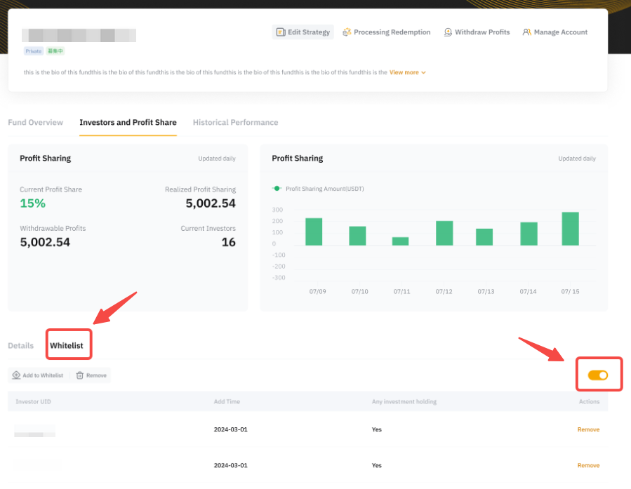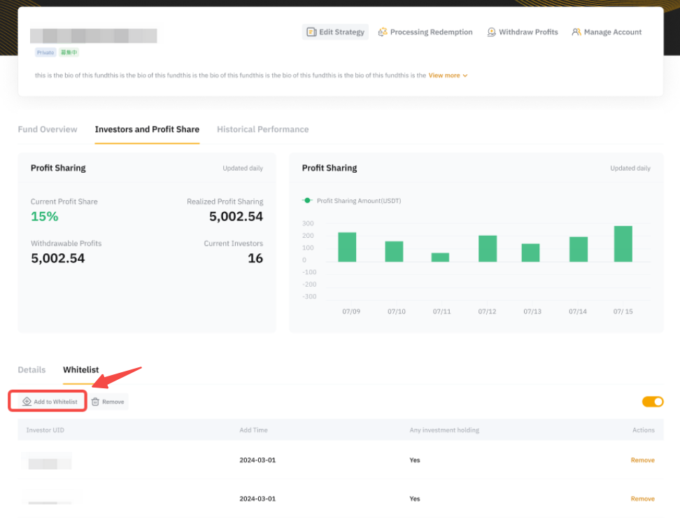 被移出白名单但目前仍有持仓的投资者仅可执行赎回操作,无法追加投资您的当前策略或跟投任何新策略。