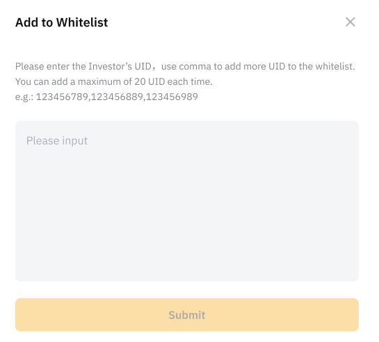 第 2 步:在弹出窗口中输入投资者 UID(如需输入多个 UID,需使用英文逗号隔开),然后点击提交。
